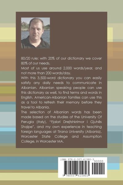 80/20 rule: with 20% of our dictionary we cover 80% of our needs. Most of us use around 2,000 words/year, and not more than 200 words/day. With this 3500-word dictionary you can easily satisfy any daily needs to communicate in Albanian. Albanian speaking people can use this dictionary as well, to find terms and words in English. American-Albanian families can use this as a tool to refresh their memory before they travel to Albania. The selection of Albanian words has been made based on the studies of the University Of Perugia (Italy), "Fjalori Drejtshkrimor i Gjuhës Shqipe", and my own experience in teaching foreign languages at Tirana University (Albania), Worcester State College and Assumption College, in Worcester MA.