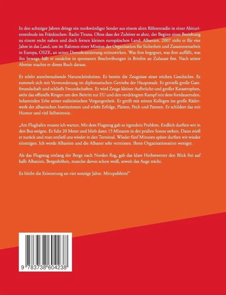 In den achtziger Jahren dringt ein merkwürdiger Sender aus einem alten Röhrenradio in einer Abiturientenbude im Fränkischen: Radio Tirana. Ohne dass der Zuhörer es ahnt, der Beginn einer Beziehung zu einem recht nahen und doch fernen kleinen europäischen Land: Albanien. 2007 zieht er für vier Jahre in das Land, um im Rahmen einer Mission der Organisation für Sicherheit und Zusammenarbeit in Europa, OSZE, an seiner Demokratisierung mitzuwirken. Was ihm begegnet, was ihm auffällt, was ihn bewegt, hält er zunächst in spontanen Beschreibungen in Briefen an Zuhause fest. Nach seiner Abreise machte er dieses Buch daraus.Er erlebt atemberaubende Naturschönheiten. Er bereist die Zeugnisse einer reichen Geschichte. Er tummelt sich mit Verwunderung im diplomatischen Getriebe der Hauptstadt. Er genießt große Gastfreundschaft und schließt Freundschaften. Er wird Zeuge kleiner Aufbrüche und großer Katastrophen, sieht das offizielle Ringen um den Beitritt zur EU und den verdrängten Kampf mit dem fortdauernden, belastenden Erbe seiner stalinistischen Vergangenheit. Er greift mit seinen Kollegen ins große Räderwerk der albanischen Institutionen und erlebt Erfolge, Pleiten, Pech und Pannen. Er schildert das mit Humor und viel Selbstironie. "Am Flughafen musste ich warten. Mit dem Flugzeug gab es irgendein Problem. Endlich durften wir in den Bus steigen. Er fuhr 20 Meter und blieb dann 15 Minuten in der prallen Sonne stehen. Dann stieß er zurück und man entließ uns wieder in den Terminal. Wieder fünf Minuten später durften wir wieder einsteigen. Ich werde Albanien und die Albaner sehr vermissen. Ihren Organisationsinn weniger.Als das Flugzeug entlang der Berge nach Norden flog, gab das klare Herbstwetter den Blick frei auf halb Albanien, Bergeshöhen, manche davon schon weiß, soweit das Auge reicht.Es bleibt die Erinnerung an vier sonnige Jahre. Mirupafshim!"