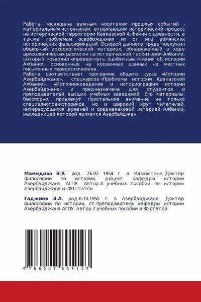 Rabota poswqschena wazhnym nositelqm proshlyh sobytij - material'nym istochnikam, otrazhaüschim istoricheskij process na istoricheskoj territorii Kawkazskoj Albanii s drewnosti, a takzhe problemam oswobozhdeniq ih ot iga armqnskih istoricheskih fal'sifikacij. Osnowoj dannogo truda posluzhil obshirnyj arheologicheskij material, obnaruzhennyj w hode arheologicheskih raskopok na istoricheskoj territorii Albanii, kotoryj pozwolil oprowergnut' oshibochnye mneniq ob istorii Albanii, osnowannye na koswennyh dannyh ne mestnyh pis'mennyh perwoistochnikow. Rabota sootwetstwuet programme obschego kursa 'Istorii Azerbajdzhana', speckursow 'Problemy istorii Kawkazskoj Albanii', 'Istochnikowedenie i istoriografiq istorii Azerbajdzhana' i prednaznachena dlq studentow i prepodawatelej wysshih uchebnyh zawedenij. Ego materialy, bessporno, priwlekut pristal'noe wnimanie ne tol'ko specialistow-istorikow, no i shirokij krug chitatelej, interesuüschihsq drewnej i srednewekowoj istoriej Albanii, naslednicej kotoroj qwlqetsq Azerbajdzhan.