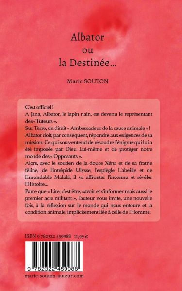 C'est officiel !A Jana, Albator, le lapin nain, est devenu le représentant des "Tuteurs".Sur Terre, on dirait "Ambassadeur de la cause animale"!Albator doit, par conséquent, répondre aux exigences de sa mission. Ce qui sous-entend de résoudre l'énigme qui lui a été imposée par Dieu Lui-même et de protéger notre monde des "Opposants".Alors, avec le soutien de la douce Xéna et de sa fratrie féline, de l'intrépide Ulysse, l'espiègle L'abeille et de l'insondable Malaki, il va affronter l'inconnu et révéler l'Histoire...Parce que "Lire, c'est être, savoir et s'informer mais aussi le premier acte militant", l'auteur nous invite, une nouvelle fois, à la réflexion sur le monde qui nous entoure et la condition animale, implicitement liée à celle de l'Homme.