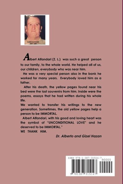 Albert Alfandari (Z. L.) was such a great person to our family, to the whole world. He helped all of us, our children, everybody who was near him.He was a very special person also in the bank he worked for many years. Everybody loved him as a father. After his death, the yellow pages found near his bed were the last souvenirs from him. Inside were the poems, essays that he had written during his whole life. We wanted to transfer his writings to the new generation. Sometimes, the old yellow pages help a person to be IMMORTAL. Albert Alfandari, with his good and loving heart was the symbol of "UNCONDITIONAL LOVE" and he deserved to be IMMORTAL." WE THANK HIM. Dr. Alberto and Gizel Hazan