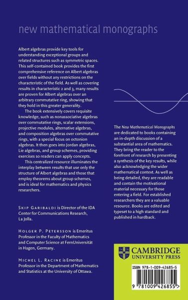 Albert algebras provide key tools for understanding exceptional groups and related structures such as symmetric spaces. This self-contained book provides the first comprehensive reference on Albert algebras over fields without any restrictions on the characteristic of the field. As well as covering results in characteristic 2 and 3, many results are proven for Albert algebras over an arbitrary commutative ring, showing that they hold in this greater generality. The book extensively covers requisite knowledge, such as non-associative algebras over commutative rings, scalar extensions, projective modules, alternative algebras, and composition algebras over commutative rings, with a special focus on octonion algebras. It then goes into Jordan algebras, Lie algebras, and group schemes, providing exercises so readers can apply concepts. This centralized resource illuminates the interplay between results that use only the structure of Albert algebras and those that employ theorems about group schemes, and is ideal for mathematics and physics researchers.