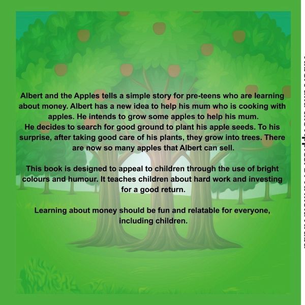 Albert and the Apples If "you're anything like me, you will agree that we need simple ideas and stories to teach our children concepts and life skills. This is more important, especially when it relates to money and finances. "Albert and the Apples," tells a simple story for pre-teens learning about money. Albert has a new idea to help his mum, who is cooking with apples. He intends to grow some apples to help her. He decides to search for good ground to plant his apple seeds. After taking good care of his plants, they grow into trees, to his surprise. There are now so many apples that Albert can sell. This book is designed to appeal to children through the use of bright colours and humour. It teaches children about hard work and investing for a good return. Learning about money should be fun and relatable for everyone, including children.