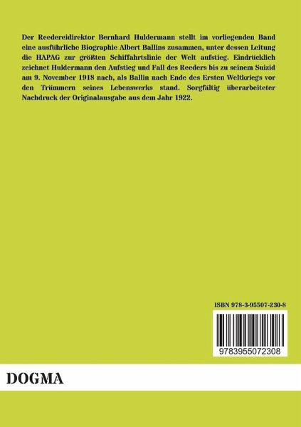 Der Reedereidirektor Bernhard Huldermann stellt im vorliegenden Band eine ausführliche Biographie Albert Ballins zusammen, unter dessen Leitung die HAPAG zur größten Schiffahrtslinie der Welt aufstieg. Eindrücklich zeichnet Huldermann den Aufstieg und Fall des Reeders bis zu seinem Suizid am 9. November 1918 nach, als Ballin nach Ende des Ersten Weltkriegs vor den Trümmern seines Lebenswerks stand.