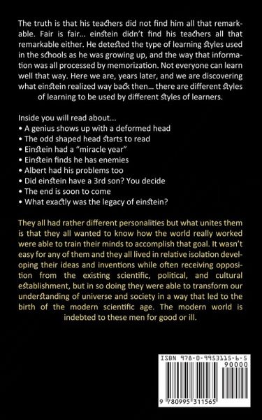 The truth is that his teachers did not find him all that remarkable. Fair is fair... einstein didn't find his teachers all that remarkable either. He detested the type of learning styles used in the schools as he was growing up, and the way that information was all processed by memorization. Not everyone can learn well that way. Here we are, years later, and we are discovering what einstein realized way back then... there are different styles of learning to be used by different styles of learners. Inside you will read about...A genius shows up with a deformed head The odd shaped head starts to read Einstein had a "miracle year" Einstein finds he has enemies Albert had his problems too Did einstein have a 3rd son? You decide The end is soon to come What exactly was the legacy of einstein? They all had rather different personalities but what unites them is that they all wanted to know how the world really worked were able to train their minds to accomplish that goal. It wasn't easy for any of them and they all lived in relative isolation developing their ideas and inventions while often receiving opposition from the existing scientific, political, and cultural establishment, but in so doing they were able to transform our understanding of universe and society in a way that led to the birth of the modern scientific age. The modern world is indebted to these men for good or ill.