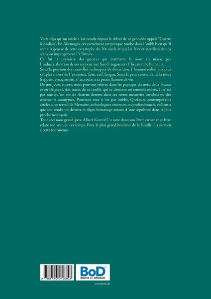 Voila deja qu´un siecle s´est ecoule depuis le debut de ce genocide appele "Guerre Mondiale". En Allemagne cet evenement est presque tombe dans l´oubli bien qu´il soit a la genese de cette catastophe du 20e siecle et que les faits et sacrifices de nos aieux en impregnerent l´Histoire.Ce fut la premiere des guerres qui instituera la mort en masse par l´industrialisation de ses moyens aux fins d´augmenter l´hecatombe humaine.Sous la pression des nouvelles techniques de destruction, l´homme reduit aux plus simples choses de l´existence, faim, soif, fatigue, sous la peur constante de la mort frappant aveuglement, s´accroche a sa petite flamme de vie.De nos jours encore, nous pouvons relever dans les paysages du nord de la France et en Belgique, des traces de ce conflit qui se dressent en temoins muets. Il n´est pas rare qu´un soc de charrue deterre dans ces terres meurtries un obus ou des ossements anonymes. Pourtant tout n´est pas oublie. Quelques contemporains atteles a un travail de memoire, archeologues amateurs ou professionnels, veillent a que soit rendu un dernier et digne hommage autour d´une sepulture dans la plus proche necropole.Tout ceci mon grand-pere Albert Krentel l´a note dans son petit carnet et ce livre relate son vecu en ces temps. Pour le plus grand bonheur de la famille, il a servecu a cette tourmente.
