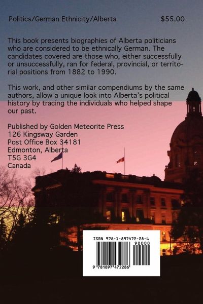 This book is a compendium of Alberta politicians who are considered to be ethnically German. Using a variety of sources, the idea behind this manuscript is that researchers will have an excellent starting point when tracing ethnic lineages in Alberta's political history