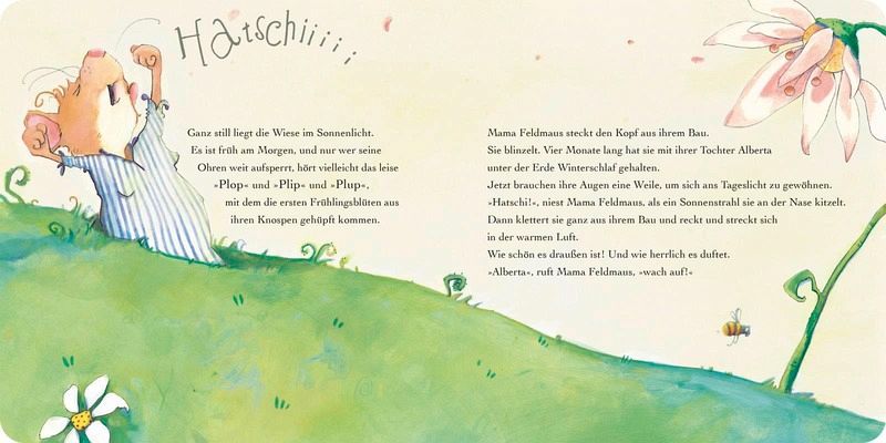 Nach dem langen Winterschlaf muss sich Alberta erstmal recken und strecken. "Der Frühling ist da!", ruft Mama Maus. "Was ist Frühling?", fragt Alberta. "Frühling ist, wenn alles erwacht"", sagt Mama Maus. "Die Mäuse, die Igel, die Bienen, die Blumen ... und die Liebe."