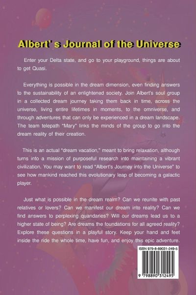Enter your Delta state, and go to your playground, things are about to get Quasi. Everything is possible in the dream dimension, even finding answers to the sustainability of an enlightened society. Join Albert's soul group in a collected dream journey taking them back in time, across the universe, living entire lifetimes in moments, to the omniverse, and through adventures that can only be experienced in a dream landscape. The team telepath "Mary" links the minds of the group to go into the dream reality of their creation. This is an actual "dream vacation," meant to bring relaxation, although turns into a mission of purposeful research into maintaining a vibrant civilization. You may want to read "Albert's Journey into the Universe" to see how mankind reached this evolutionary leap of becoming a galactic player. Just what is possible in the dream realm? Can we reunite with past relatives or lovers? Can we manifest our dream into reality? Can we find answers to perplexing quandaries? Will our dreams lead us to a higher state of being? Are dreams the foundations for all agreed reality? Explore these questions in a playful story. Keep your hand and feet inside the ride the whole time, have fun, and enjoy this epic adventure.