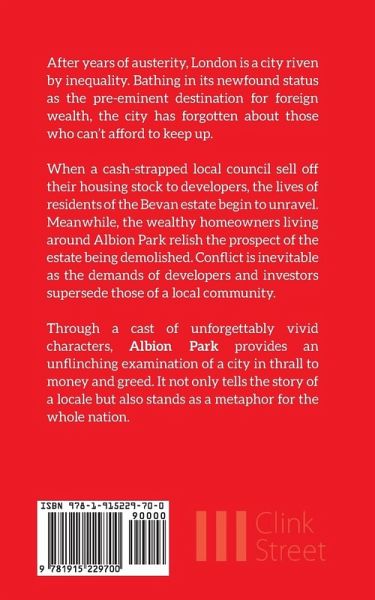 After years of austerity, London is a city riven by inequality. Bathing in its newfound status as the pre-eminent destination for foreign wealth, the city has forgotten about those who can't afford to keep up. When a cash-strapped local council sell off their housing stock to developers, the lives of residents of the Bevan estate begin to unravel. Meanwhile, the wealthy homeowners living around Albion Park relish the prospect of the estate being demolished. Conflict is inevitable as the demands of developers and investors supersede those of a local community. Through a cast of unforgettably vivid characters, Albion Park provides an unflinching examination of a city in thrall to money and greed. It not only tells the story of a locale but also stands as a metaphor for the whole nation.