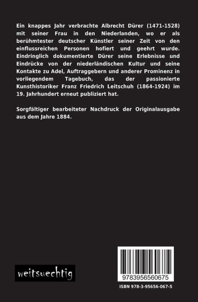 Ein knappes Jahr verbrachte Albrecht Dürer (1471-1528) mit seiner Frau in den Niederlanden, wo er als berühmtester deutscher Künstler seiner Zeit von den einflussreichen Personen hofiert und geehrt wurde. Eindringlich dokumentierte Dürer seine Erlebnisse und Eindrücke von der niederländischen Kultur und seine Kontakte zu Adel, Auftraggebern und anderer Prominenz in vorliegendem Tagebuch, das der passionierte Kunsthistoriker Franz Friedrich Leitschuh (1864-1924) im 19. Jahrhundert erneut publiziert hat.