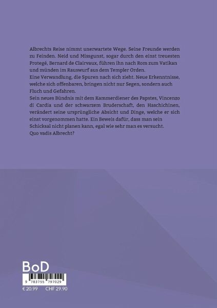 Albrechts Reise nimmt unerwartete Wege. Seine Freunde werden zu Feinden. Neid und Missgunst, sogar durch den einst treuesten Protegé, Bernard de Clairvaux, führen ihn nach Rom zum Vatikan und münden im Rauswurf aus dem Templer Orden. Eine Verwandlung, die Spuren nach sich zieht. Neue Erkenntnisse, welche sich offenbaren, bringen nicht nur Segen, sondern auch Fluch und Gefahren.Sein neues Bündnis mit dem Kammerdiener des Papstes, Vincenzo di Cardia und der schwarzem Bruderschaft, den Haschichinen, verändert seine ursprüngliche Absicht und Dinge, welche er sich einst vorgenommen hatte. Ein Beweis dafür, dass man sein Schicksal nicht planen kann, egal wie sehr man es versucht.Quo vadis Albrecht?