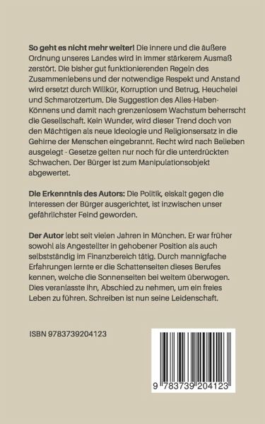 So geht es nicht mehr weiter! Die innere und die äußere Ordnung unseres Landes wird in immer stärkerem Ausmaß zerstört. Die bisher gut funktionierenden Regeln des Zusammenlebens und der notwendige Respekt und Anstand wird ersetzt durch Willkür, Korruption und Betrug, Heuchelei und Schmarotzertum. Die Suggestion des Alles-Haben-Könnens und damit nach grenzenlosem Wachstum beherrscht die Gesellschaft. Kein Wunder, wird dieser Trend doch von den Mächtigen als neue Ideologie und Religionsersatz in die Gehirne der Menschen eingebrannt. Recht wird nach Belieben ausgelegt - Gesetze gelten nur noch für die unterdrückten Schwachen. Der Bürger ist zum Manipulationsobjekt abgewertet.Dem Autor, der lediglich friedlich und relativ frei in seiner Stadt, seinem Land mit dessen Traditionen und Kultur leben will, reicht es jetzt. In seiner Streitschrift betrachtet er den derzeitigen Zustand der Gesellschaft. Welche Rolle die Politik, die Medien, das Geldunwesen und weitere Einflussgrößen hierbei spielen. Insbesondere angesichts der in jüngster Zeit erfolgten extrem negativen Entwicklungen erfährt er eine Steigerung seines ursprünglichen Unbehagens über steigenden Ärger hin zum Ausdruck von Wut über die eingetretenen Verhältnisse. Als Dreh- und Angelpunkt macht er die Politik aus, und hier insbesondere bestimmte Personen und Gruppen, die das gesellschaftliche Klima vergiften; durch ihr Reden und Handeln die Bürger gegeneinander aufhetzen. Die politische Führungsclique ist aktiv angetreten, die Gesellschaft zu spalten und dadurch womöglich in einen Bürgerkrieg zu treiben.Die Erkenntnis des Autors: Die Politik, eiskalt gegen die Interessen der Bürger ausgerichtet, ist inzwischen unser gefährlichster Feind geworden.