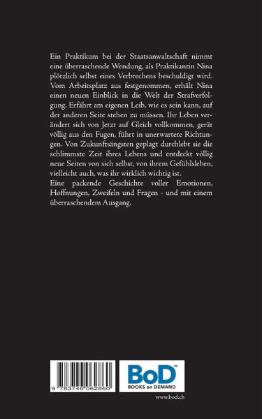 Ein Praktikum bei der Staatsanwaltschaft nimmt eine überraschende Wendung, als Praktikantin Nina plötzlich selbst eines Verbrechens beschuldigt wird. Vom Arbeitsplatz aus festgenommen, erhält Nina einen neuen Einblick in die Welt der Strafverfolgung. Erfährt am eigenen Leib, wie es sein kann, auf der anderen Seite stehen zu müssen. Ihr Leben verändert sich von Jetzt auf Gleich vollkommen, gerät völlig aus den Fugen, führt in unerwartete Richtungen. Von Zukunftsängsten geplagt, durchlebt sie die schlimmste Zeit ihres Lebens und entdeckt völlig neue Seiten von sich selbst, von ihrem Gefühlsleben, vielleicht auch, was ihr wirklich wichtig ist.Eine packende Geschichte voller Emotionen, Hoffnungen, Zweifeln und Fragen - und mit einem überraschenden Ausgang.