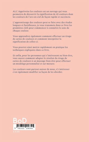 ALC Apprivoise les couleurs est un ouvrage qui vous permettra de découvrir la signification de 42 couleurs dont les couleurs de l'arc-en-ciel de façon rapide et succincte.L'apprentissage des couleurs peut se faire avec des études longues et fastidieuses, je vous transmets dans ce livre les premières clefs pour commencer à connaître le sens de chaque couleur.Vous apprendrez également comment effectuer un tirage de cartes de couleurs et comment interpréter la signification de celles-ci.Vous pourrez ainsi mettre rapidement en pratique les techniques expliquées dans ce livre.Et enfin, pour les personnes qui s'intéressent au bien-être, vous saurez comment adapter le résultat du tirage de cartes de couleurs à un massage bien-être pour effectuer un modelage personnalisé et sur-mesure.Les couleurs sont partout autour de nous, s'y intéresser c'est également modifier sa façon de les aborder.