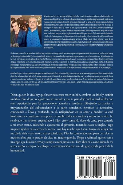 Dicen que en la vida hay que hacer tres cosas: tener un hijo, sembrar un árbol y escribir un libro. Para dejar un legado en este mundo y que tu paso deje huellas perdurables que sean experiencias para las generaciones actuales y venideras, dibujando tus sueños y proyectándolos del subconsciente a la parte consciente, elevando la autoestima, conociendo a Dios y con ando en él, refugiándose en su amor y bondad, lo cual nalmente me ayudaron a empezar a cumplir todos mis sueños y metas en la vida: he sembrado tres árboles, engendrado 6 hijos, estoy tomando clases de canto para cantarle a mi amor eterno, asistiendo a ejercitarme al gimnasio, tomando clases de inglés, juego un poco ajedrez para ejercitar la mente, aún hay mucho que hacer. Tengo a la mujer que me dio la vida y es el tesoro más preciado que Dios ha conservado para pasar con ella sus muchos años que le queden de vida: mi madre querida. Tengo a Abimael, que es como un ángel que Dios me envió y siempre estará junto a mí. Este libro es la conclusión de mi tercer sueño: ejemplo de enfoque y determinación que será de gran ayuda para toda la humanidad.