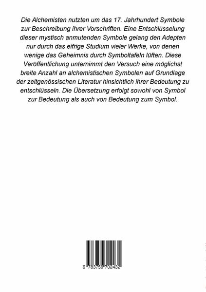 Die Nutzung alchemistischer Symbole und ihre Übersetzung auf Basis der Literatur aus dem 17. und 18. Jahrhundert wird in dieser Veröffentlichung auf 50 Seiten behandelt. Sie diskutiert die Verwendung von Symbolen in alchemistischen Texten der Neuzeit und die Herausforderungen beim Druck und ihrer Interpretation aufgrund von Mehrdeutigkeit und fehlender Rückwärtszuordnung. Ein im Buch vorhandenes Register ermöglicht die Übersetzung der alchemistischen Symbole von Symbol zu Bedeutung und umgekehrt basierend auf den Quellen des 17./18. Jahrhunderts.