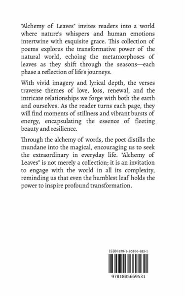 "Alchemy of Leaves" invites readers into a world where nature's whispers and human emotions intertwine with exquisite grace. This collection of poems explores the transformative power of the natural world, echoing the metamorphoses of leaves as they shift through the seasons-each phase a reflection of life's journeys. With vivid imagery and lyrical depth, the verses traverse themes of love, loss, renewal, and the intricate relationships we forge with both the earth and ourselves. As the reader turns each page, they will find moments of stillness and vibrant bursts of energy, encapsulating the essence of fleeting beauty and resilience. Through the alchemy of words, the poet distills the mundane into the magical, encouraging us to seek the extraordinary in everyday life. "Alchemy of Leaves" is not merely a collection; it is an invitation to engage with the world in all its complexity, reminding us that even the humblest leaf holds the power to inspire profound transformation.