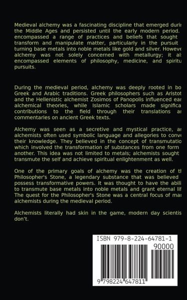 Medieval alchemy was a fascinating discipline that emerged during the Middle Ages and persisted until the early modern period. It encompassed a range of practices and beliefs that sought to transform and manipulate matter, particularly in the pursuit of turning base metals into noble metals like gold and silver. However, alchemy was not solely concerned with metallurgy; it also encompassed elements of philosophy, medicine, and spiritual pursuits. During the medieval period, alchemy was deeply rooted in both Greek and Arabic traditions. Greek philosophers such as Aristotle and the Hellenistic alchemist Zosimos of Panopolis influenced early alchemical theories, while Islamic scholars made significant contributions to the field through their translations and commentaries on ancient Greek texts. Alchemy was seen as a secretive and mystical practice, and alchemists often used symbolic language and allegories to convey their knowledge. They believed in the concept of transmutation, which involved the transformation of substances from one form to another. This idea was not limited to metals; alchemists sought to transmute the self and achieve spiritual enlightenment as well. One of the primary goals of alchemy was the creation of the Philosopher's Stone, a legendary substance that was believed to possess transformative powers. It was thought to have the ability to transmute base metals into noble metals and grant eternal life. The quest for the Philosopher's Stone was a central focus of many alchemists during the medieval period. Alchemy also had significant overlaps with early chemistry and medicine. Alchemists developed laboratory techniques, experimental methods, and apparatus that laid the groundwork for modern chemistry. They experimented with various substances, attempting to purify them and create new compounds. These experiments eventually led to advancements in the understanding of chemical processes. Over time, the practice of alchemy gradually evolved into modern chemistry, as scientific methods and approaches gained prominence. The emergence of the scientific method in the 17th century, coupled with the work of figures like Robert Boyle, Antoine Lavoisier, and others, marked a shift away from the mystical and spiritual aspects of alchemy towards a more empirical and evidence-based approach. While alchemy did not achieve its primary goal of turning base metals into gold or discovering the Philosopher's Stone, its legacy can still be seen in the development of chemistry and the understanding of natural processes. It also played a significant role in shaping the philosophical and cultural landscape of the Middle Ages. Alchemists had literally skin in the game, modern day scientists don't.