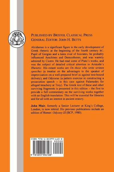 Alcidamas is an important figure in the development of Greek rhetoric early in the fourth century BC. Pupil of Gorgias, rival of Isocrates, and teacher of Aeschines, he also influenced Demosthenes and was later admired by both Aristotle and Cicero. His extant works are "On Those who Write Written Speeches" (a treatise on the oratorical practice of improvisation on a well-prepared brief) and "Odysseus" (a pattern exercise in constructing a prosecution). Other fragments survive and all are presented in this edition, which translates them into English and provides a full commentary on the whole surviving oeuvre.