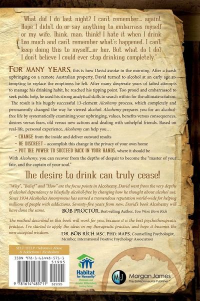 Alcohemy offers real, practical advice and a proven solution to those struggling with an alcohol habit. It reveals the extent of the problems alcohol causes globally and the resulting human suffering. David Norman describes how he innocently started down the casual alcohol-drinking path and the ensuing struggle his full-blown dependency caused him and his family. Based on extensive research and proven by personal experience, Alcohemy is unique in its holistic and practical approach that first addresses the psychology of habits before providing a step-by-step plan for you to work through yourself in the privacy of your own home. Alcohemy delivers a practical, proven, and easy-to-follow plan for a permanent alcohol-free life.