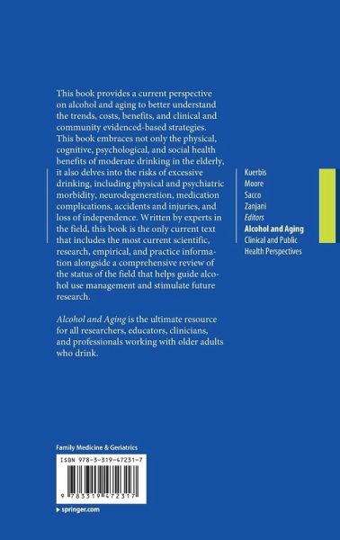 This book provides a current perspective on alcohol and aging to better understand the trends, costs, benefits, and clinical and community evidenced-based strategies. This book embraces not only the physical, cognitive, psychological, and social health benefits of moderate drinking in the elderly, it also delves into the risks of excessive drinking, including physical and psychiatric morbidity, neurodegeneration, medication complications, and accidents and injuries, and loss of independence. Written by experts in the field, this book is the only current text that includes the most current scientific, research, empirical, and practice information alongside a comprehensive review of the status of the field that will help guide alcohol use management and stimulate future research.