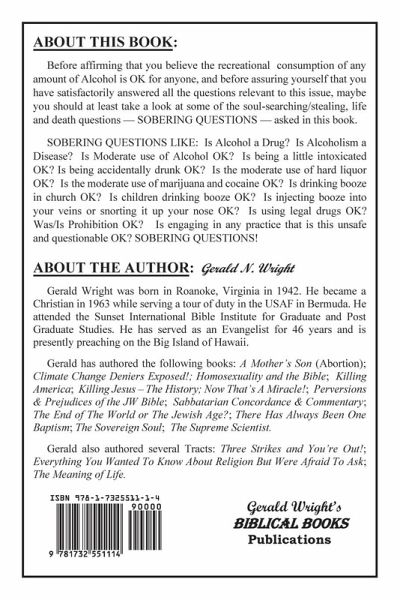 This book -- "Alcohol and the Bible/Sobering Questions" -- answers the following important questions about social and recreational consumption of Alcohol. Is Alcohol an Intoxicating Drug? Is Alcoholism a Disease? Is Moderate Use of Alcohol OK? Is being a Little Intoxicated OK? Is being Drunk Accidentally OK? Is Moderate use of Marijuana or Cocaine OK? Is Drinking Booze in Church OK? Is Children Drinking Wine OK? Is IV use of Booze OK? Is using Legal/Taxed Drugs OK? Is/was Prohibition of Booze OK? Is Engaging in any Practice this Questionable and Unsafe OK?