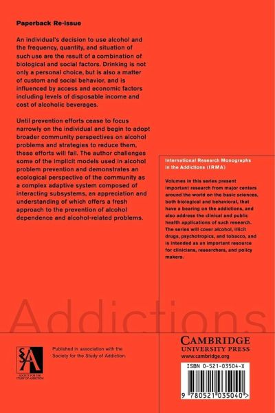 Series editor's preface; Acknowledgements; 1. The community system of alcohol use and alcohol problems; 2. Consumption system; 3. Retail sales subsystem: alcohol availability and promotion; 4. Formal regulation and control subsystem: rules, administration and enforcement; 5. Social norms subsystem: community values and social influences that affect drinking; 6. Legal sanctions subsystem: prohibited uses of alcohol; 7. Social, economic and health consequences subsystem: community identification of and responses to alcohol problems; 8. Community-level alcohol problem prevention; References; Index.