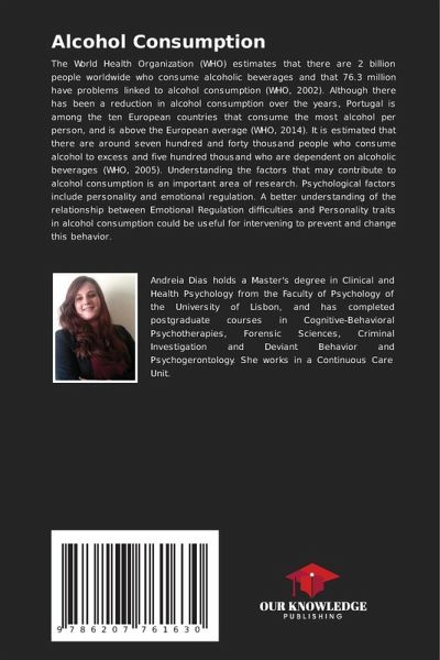 The World Health Organization (WHO) estimates that there are 2 billion people worldwide who consume alcoholic beverages and that 76.3 million have problems linked to alcohol consumption (WHO, 2002). Although there has been a reduction in alcohol consumption over the years, Portugal is among the ten European countries that consume the most alcohol per person, and is above the European average (WHO, 2014). It is estimated that there are around seven hundred and forty thousand people who consume alcohol to excess and five hundred thousand who are dependent on alcoholic beverages (WHO, 2005). Understanding the factors that may contribute to alcohol consumption is an important area of research. Psychological factors include personality and emotional regulation. A better understanding of the relationship between Emotional Regulation difficulties and Personality traits in alcohol consumption could be useful for intervening to prevent and change this behavior.