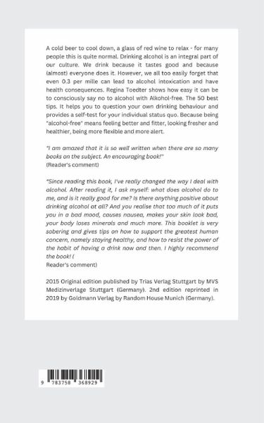A cold beer to cool down, a glass of red wine to relax - for many people this is quite normal. Drinking alcohol is an integral part of our culture. We drink because it tastes good and because (almost) everyone does it. However, we all too easily forget that even 0.3 per mille can lead to alcohol intoxication and have health consequences. Regina Toedter shows how easy it can be to consciously say no to alcohol with Alkohol-free. The 50 best tips. It helps you to question your own drinking behaviour and provides a self-test for your individual status quo. Because being "alcohol-free" means feeling better and fitter, looking fresher and healthier, being more flexible and more alert.2015 Original edition published by Trias Verlag Stuttgart by MVS Medizinverlage Stuttgart (Germany). 2nd edition reprinted in 2019 by Goldmann Verlag by Random House Munich (Germany).