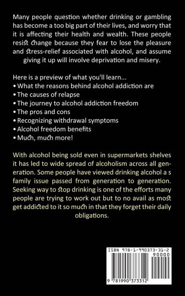Many people question whether drinking or gambling has become a too big part of their lives, and worry that it is affecting their health and wealth. These people resist change because they fear to lose the pleasure and stress-relief associated with alcohol, and assume giving it up will involve deprivation and misery. Here is a preview of what you'll learn... ¿ What the reasons behind alcohol addiction are ¿ The causes of relapse ¿ The journey to alcohol addiction freedom ¿ The pros and cons ¿ Recognizing withdrawal symptoms ¿ Alcohol freedom benefits ¿ Much, much more! With alcohol being sold even in supermarkets shelves it has led to wide spread of alcoholism across all generation. Some people have viewed drinking alcohol a s family issue passed from generation to generation. Seeking way to stop drinking is one of the efforts many people are trying to work out but to no avail as most get addicted to it so much in that they forget their daily obligations.