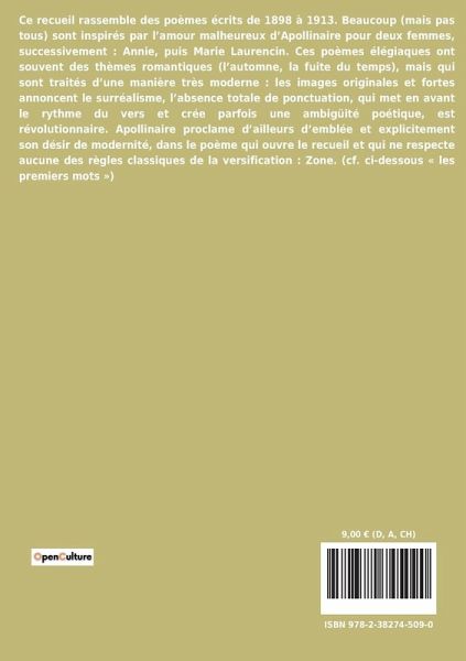 Ce recueil rassemble des poèmes écrits de 1898 à 1913. Beaucoup (mais pas tous) sont inspirés par l¿amour malheureux d¿Apollinaire pour deux femmes, successivement : Annie, puis Marie Laurencin. Ces poèmes élégiaques ont souvent des thèmes romantiques (l¿automne, la fuite du temps), mais qui sont traités d¿une manière très moderne : les images originales et fortes annoncent le surréalisme, l¿absence totale de ponctuation, qui met en avant le rythme du vers et crée parfois une ambigüité poétique, est révolutionnaire. Apollinaire proclame d¿ailleurs d¿emblée et explicitement son désir de modernité, dans le poème qui ouvre le recueil et qui ne respecte aucune des règles classiques de la versification : Zone. (cf. ci-dessous « les premiers mots »)