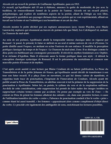 "Alcools" est un recueil de poèmes de Guillaume Apollinaire, publié en 1913, qui marque un changement significatif dans la poésie moderne. Le recueil se distingue par l'absence de ponctuation, une évolution qui confère une fluidité et une musicalité particulières aux vers. Les poèmes abordent des thèmes variés tels que l'amour, la modernité, la mémoire et le passage du temps. "Zone", le poème d'ouverture, illustre le contraste entre le monde ancien et la modernité, symbolisé par des images de la ville de Paris et des références à la technologie émergente. "Le Pont Mirabeau" explore la douleur de l'amour perdu, tandis que "La Chanson du Mal-Aimé" exprime la mélancolie et le regret. Apollinaire utilise des métaphores audacieuses et des images saisissantes pour évoquer des émotions complexes et des réflexions changeantes sur la condition humaine. Le recueil est également marqué par des références culturelles et mythologiques, donnant ainsi au texte une dimension intemporelle. "Alcools" est considéré comme une uvre majeure de la poésie du XXe siècle, influençant de nombreux poètes par son style novateur et sa profondeur thématique.