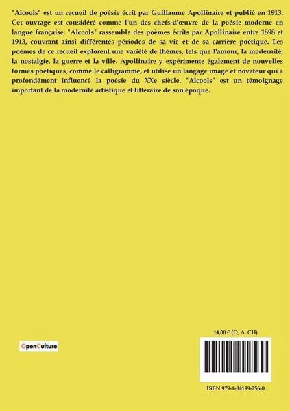 "Alcools" est un recueil de poésie écrit par Guillaume Apollinaire et publié en 1913. Cet ouvrage est considéré comme l'un des chefs-d'¿uvre de la poésie moderne en langue française. "Alcools" rassemble des poèmes écrits par Apollinaire entre 1898 et 1913, couvrant ainsi différentes périodes de sa vie et de sa carrière poétique. Les poèmes de ce recueil explorent une variété de thèmes, tels que l'amour, la modernité, la nostalgie, la guerre et la ville. Apollinaire y expérimente également de nouvelles formes poétiques, comme le calligramme, et utilise un langage imagé et novateur qui a profondément influencé la poésie du XXe siècle. "Alcools" est un témoignage important de la modernité artistique et littéraire de son époque.