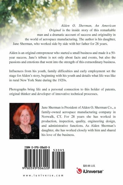 Alden O. Sherman, An American Original is the inside story of this remarkable man and a dramatic account of success and originality in the world of aerospace manufacturing. The author is his daughter, Jane Sherman, who worked side by side with her father for 28 years. Alden is an original entrepreneur who started a small business and made it a 50-year success. Jane's tribute is not only about facts and events, but also the passions and emotions that went into the strength of this extraordinary business. Influences from his youth, family difficulties and early employment set the stage for Alden's story, beginning with his youth and details what life was like in rural New York State during the 1920s. Photographs bring life and a personal connection to this holder of patents, original thinker and developer of innovative technical processes.