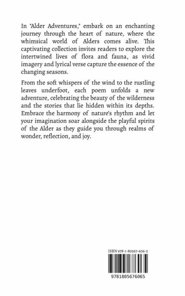 In "Alder Adventures," embark on an enchanting journey through the heart of nature, where the whimsical world of Alders comes alive. This captivating collection invites readers to explore the intertwined lives of flora and fauna, as vivid imagery and lyrical verse capture the essence of the changing seasons. From the soft whispers of the wind to the rustling leaves underfoot, each poem unfolds a new adventure, celebrating the beauty of the wilderness and the stories that lie hidden within its depths. Embrace the harmony of nature's rhythm and let your imagination soar alongside the playful spirits of the Alder as they guide you through realms of wonder, reflection, and joy.