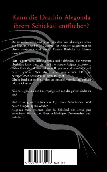 Das ist ja schön und gut mit der alten Vereinbarung zwischen den Menschen und ihrer Dynastie, aber musste ausgerechnet sie diesen arroganten und groben Prinzen Barthalor als Herren erwischen?Nein, damit kann sich Alegonda nicht abfinden. Sie verspürt keine Lust, die von ihr erwartete Aufgabe anzutreten. Lieber flieht sie auf eine verlassene Burgruine und wartet dort auf bessere Zeiten. Aber dann steht ausgerechnet ER, mit betrügerischen Absichten, in ihrem Burghof. Glaubt Barthalor im Ernst, dass sie ihm alles verzeiht und einfach mit zurückkommt? Was hat eigentlich der Bauernjunge Leo mit der ganzen Sache zu tun?Und schon gerät das friedliche Idyll ihres Zufluchtsortes und dessen Umgebung ins Wanken. Alegonda muss erkennen, dass das Schicksal sich etwas ganz besonderes für sie und ihren zukünftigen Drachenreiter ausgedacht hat.