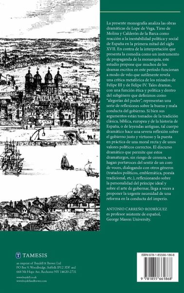 La presente monografía analiza las obras dramáticas de Lope de Vega, Tirso de Molina y Calderón de la Barca como reacción a la inestabilidad política y social de España en la primera mitad del siglo XVII. En contra de la inteación que presenta la comedia como un instrumento de propaganda de la monarquía, este estudio propone que muchos de los dramas escritos en este período funcionan a modo de velo que sutilmente revela una crítica metafórica de los reinados de Felipe III y de Felipe IV. Tales dramas, con una función ética y política y dentro del subgénero que definimos como "alegorías del poder", representan una serie de reflexiones sobre la buena y mala conducta del gobierno. Si bien sus argumentos están tomados de la tradición clásica, bíblica, europea y de la historia de España, o de leyendas antiguas, tal cuerpo dramático hace una severa reflexión sobre el gobierno justo y virtuoesta en práctica de una moral recta y de unos valores políticos correctos. El discurso dramático que permite que estos dramaturgos, sin riesgo de censura, se hagan portavoces del sentir de un coro de voces, dialogando con otros géneros (tratados políticos, emblemática, poesía tradicional, etc.), reflexionando sobre la personalidad del príncipe ideal y sobre el arte de gobernar, llega a veces a proponer la urgente necesidad de una reforma en la conducta del imperio. Antonio Carreño-Rodríguez es profesor asistente de español, George Mason University.