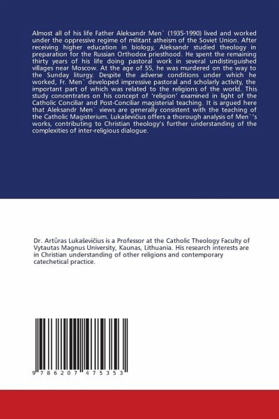 Almost all of his life Father Aleksandr Men` (1935-1990) lived and worked under the oppressive regime of militant atheism of the Soviet Union. After receiving higher education in biology, Aleksandr studied theology in preparation for the Russian Orthodox priesthood. He spent the remaining thirty years of his life doing pastoral work in several undistinguished villages near Moscow. At the age of 55, he was murdered on the way to the Sunday liturgy. Despite the adverse conditions under which he worked, Fr. Men` developed impressive pastoral and scholarly activity, the important part of which was related to the religions of the world. This study concentrates on his concept of 'religion' examined in light of the Catholic Conciliar and Post-Conciliar magisterial teaching. It is argued here that Aleksandr Men` views are generally consistent with the teaching of the Catholic Magisterium. Lukasevicius offers a thorough analysis of Men`'s works, contributing to Christian theology's further understanding of the complexities of inter-religious dialogue.