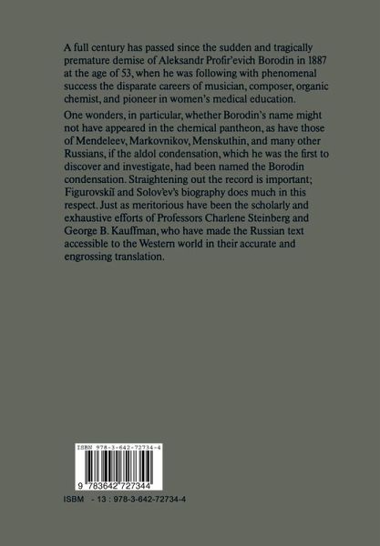 A full century has passed since the sudden and tragically premature demise of Aleksandr Porfir'evich Borodin in 1887 at the age of 53, when he was following with phenomenal success the disparate careers of musician, composer, organic chemist, and pioneer in women's medical education. As a unique figure among the remarkable group of geniuses who suddenly appeared in Russia in the middle of the last century and explosively propelled that country into the mainstream of world culture in the arts, humanities, and sciences, it might have been expected that Borodin was the object of much research. There is no doubt that the Russian contribution to the amazing development of structural chemistry in the last century has tended to be underplayed, while that in the rest of Europe has received much more attention. One wonders, in particular, whether Borodin's name might not have appeared in the chemical pantheon, as have those of Mendeleev, Markovnikov, Menshutkin, and many other Russians, if the aldol condensation, which he was the first to discover and investigate, had been named the Borodin condensation. Straightening out the record is important; Figurovskii and Solov'ev's biography does much in this respect. Just as meritorious have been the scholarly and exhaustive efforts of Professors Charlene Steinberg and George B. Kauffman, who have made the Russian text accessible to the Western world in their accurate and engrossing translation.