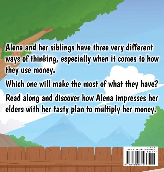 Alena Changes Everything is a colorful, hardcover children's book which follows the story of three young siblings and their creative use of money. The blurb reads: Alena and her siblings have three very different ways of thinking, especially when it comes to how they use money. Which one will make the most of what they have? Read along and discover how Alena impresses her elders with her tasty plan to multiply her money. Alena and her siblings have three very different ways of thinking, especially when it comes to how they use money. Which one will make the most of what they have? Read along and discover how Alena impresses her elders with her tasty plan to multiply her money.