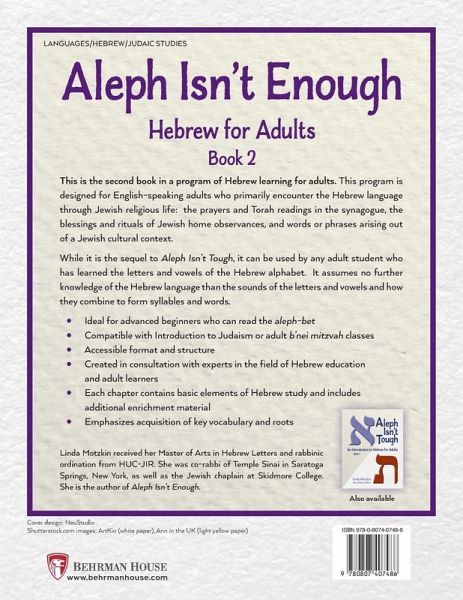 This is the second book in the URJ's program for Hebrew learning for adults. This program is designed for English-speaking adults who primarily encounter the Hebrew language through Jewish religious life: the prayers and Torah readings in the synagogue, the blessings and rituals of Jewish home observances, and words or phrases arising out of a Jewish cultural context. While it is the sequel to Aleph Isn't Tough, it can be used by any adult student who has learned the letters and vowels of the Hebrew alphabet, whether they attained that knowledge from Aleph Isn't Tough or through some other means of instruction. It assumes no further knowledge of the Hebrew language than the sounds of the letters and vowels and how they combine to form syllables and words.