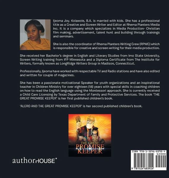 Alero and The Great Promise Keeper is the second episode of The Great Promise Keeper. It is a children's book that can also serve as a family time story book because it focuses on teaching and character building among young people, as well as the adults. It is a story about a young and talented little girl Alero, and how she struggled with the habit of stealing alongside with learning a lifelong lesson of self-control and integrity. We also see the love and wisdom of The Great PROMISE Keeper, whose ultimate assignment of helping people all over the world stay bound to their words by keeping their promises whether big or small. A Promise was sacred to him. Helping Alero overcome her greatest challenge, will help every child who has a different or similar struggle, be the best they can ever be. It is therefore a great message with urgent need because of the situation in our society today. "DON'T SAY IT IF YOU DON'T MEAN IT!"