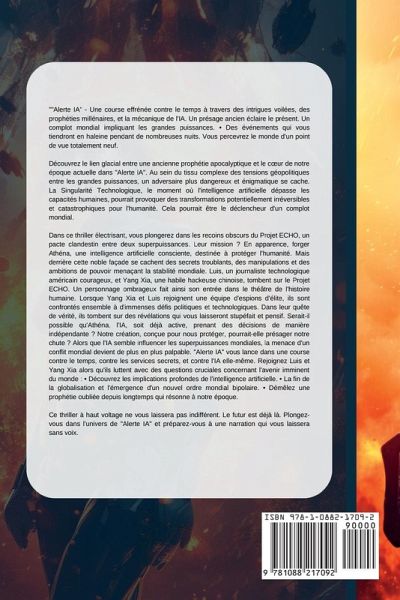 "Alerte IA" - Une course effrénée contre le temps à travers des intrigues voilées, des prophéties millénaires, et la mécanique de l'IA. Un présage ancien éclaire le présent. Un complot mondial impliquant les grandes puissances. ¿ Des événements qui vous tiendront en haleine pendant de nombreuses nuits. Vous percevrez le monde d'un point de vue totalement neuf. Découvrez le lien glacial entre une ancienne prophétie apocalyptique et le c¿ur de notre époque actuelle dans "Alerte IA". Au sein du tissu complexe des tensions géopolitiques entre les grandes puissances, un adversaire plus dangereux et énigmatique se cache. La Singularité Technologique, le moment où l'intelligence artificielle dépasse les capacités humaines, pourrait provoquer des transformations potentiellement irréversibles et catastrophiques pour l'humanité. Cela pourrait être le déclencheur d'un complot mondial. Dans ce thriller électrisant, vous plongerez dans les recoins obscurs du Projet ECHO, un pacte clandestin entre deux superpuissances. Leur mission ? En apparence, forger Athéna, une intelligence artificielle consciente, destinée à protéger l'humanité. Mais derrière cette noble façade se cachent des secrets troublants, des manipulations et des ambitions de pouvoir menaçant la stabilité mondiale. Luis, un journaliste technologique américain courageux, et Yang Xia, une habile hackeuse chinoise, tombent sur le Projet ECHO. Un personnage ombrageux fait ainsi son entrée dans le théâtre de l'histoire humaine. Lorsque Yang Xia et Luis rejoignent une équipe d'espions d'élite, ils sont confrontés ensemble à d'immenses défis politiques et technologiques. Dans leur quête de vérité, ils tombent sur des révélations qui vous laisseront stupéfait et pensif. Serait-il possible qu'Athéna, l'IA, soit déjà active, prenant des décisions de manière indépendante ? Notre création, conçue pour nous protéger, pourrait-elle présager notre chute ? Alors que l'IA semble influencer les superpuissances mondiales, la menace d'un conflit mondial devient de plus en plus palpable. "Alerte IA" vous lance dans une course contre le temps, contre les services secrets, et contre l'IA elle-même. Rejoignez Luis et Yang Xia alors qu'ils luttent avec des questions cruciales concernant l'avenir imminent du monde : ¿ Découvrez les implications profondes de l'intelligence artificielle. ¿ La fin de la globalisation et l'émergence d'un nouvel ordre mondial bipolaire. ¿ Démêlez une prophétie oubliée depuis longtemps qui résonne à notre époque. Ce thriller à haut voltage ne vous laissera pas indifférent. Le futur est déjà là. Plongez-vous dans l'univers de "Alerte IA" et préparez-vous à une narration qui vous laissera sans voix.