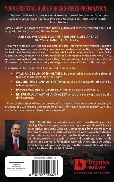 Your essential guide for End-Times Preparation. "I believe this book is a prophetic work releasing a word from the Lord about the urgency of preparing for perilous times and learning to stay alert and on watch." - James Durham James Durham is a seasoned minister, prolific author, and seer who received a series of prophetic visions concerning the end times. Are you prepared for the perilous times ahead? Don't be caught off guard. These visions began with families packing for a trip. However, they were not packing for ordinary travel or vacation; they were rushed, anxious and frantic. He realized that each of these families was moving towards a safe location during troubling times. Oddly enough, they seemed to be both prepared and unprepared at the same time. They were reviewing their lists, making sure they had everything-but in the spirit, James discerned that they were most likely missing some essential items for the journey. In preparation for the perilous times ahead, learn how to: Walk under an open Heaven. Be anchored in peace during times of fear, chaos and darkness on the Earth. Discern the signs of the times so you are not caught off guard by unfolding events. Expose and resist deception from the powers of darkness. Be spiritually awake and alert so you are not swept away by the devil's agenda. "Times of tribulation will not be the end of your story if you are a born-again disciple of Jesus. You will not end with failure or defeat. The victory has already been won. You are in the winner's circle. You are an overcomer!"