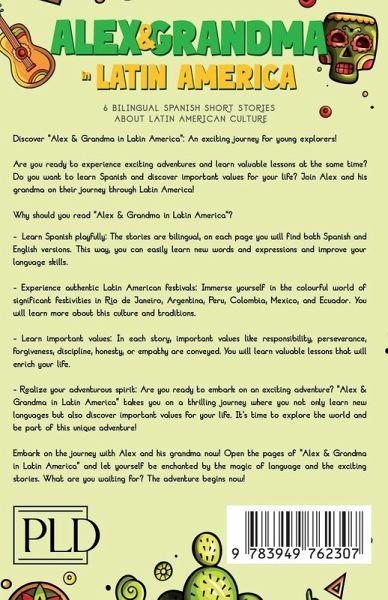 Discover "Alex & Grandma in Latin America": An exciting journey for young explorers! Are you ready to experience exciting adventures and learn valuable lessons at the same time? Do you want to learn Spanish and discover important values for your life? Join Alex and his grandma on their journey through Latin America! Why should you read "Alex & Grandma in Latin America"? Learn Spanish playfully: The stories are bilingual, on each page you will find both Spanish and English versions. This way, you can easily learn new words and expressions and improve your language skills. Experience authentic Latin American festivals: Immerse yourself in the colourful world of significant festivities in Rio de Janeiro, Argentina, Peru, Colombia, Mexico, and Ecuador. You will learn more about this culture and traditions. Learn important values: In each story, important values like responsibility, perseverance, forgiveness, discipline, honesty, or empathy are conveyed. You will learn valuable lessons that will enrich your life. Realize your adventurous spirit: Are you ready to embark on an exciting adventure? "Alex & Grandma in Latin America" takes you on a thrilling journey where you not only learn new languages but also discover important values for your life. It's time to explore the world and be part of this unique adventure! Embark on the journey with Alex and his grandma now! Open the pages of "Alex & Grandma in Latin America" and let yourself be enchanted by the magic of language and the exciting stories. What are you waiting for? The adventure begins now!