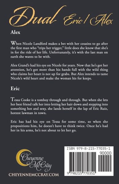 Alex When Nicole Landford makes a bet with her cousins to go after the first man who "trips her trigger," little does she know that she's in for the ride of her life. Unfortunately, it's with the last man on earth she wants to be with. Alex Grand's had his eye on Nicole for years. Now that he's got her attention, he's got more than his hands full with the wild thing who claims her heart is not up for grabs. But Alex intends to tame Nicole's wild heart and make the woman his for keeps. Eric Tessa Cooke is a tomboy through and through. But when she lets her best friend talk her into letting her hair down and stepping into something hot and sexy, she lands herself in the lap of Eric Ruiz, hottest lawman in town. Eric has had his eye on Tessa for some time, so when she propositions him, he doesn't have to think twice. Once he's had her in his arms, he's not about to let her go.
