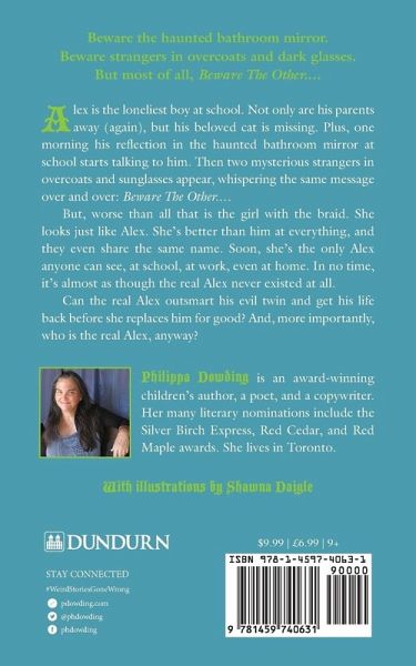 Beware The Other ... Alex is the loneliest boy at school. Not only are his parents away (again), but his beloved cat is missing. Plus, one morning his reflection in the haunted bathroom mirror at school starts talking to him. Then two mysterious strangers in overcoats and sunglasses appear, whispering the same message, over and over: Beware The Other.... But, worse than all that, is the girl with the braid. She looks just like Alex. She's better than him at everything, and they even share the same name. Soon, she's the only Alex anyone can see, at school, at work, even at home. In no time, it's almost as though the real Alex never existed at all. Can the real Alex outsmart his evil twin and get his life back before she replaces him for good? And, more importantly, who is the real Alex, anyway?