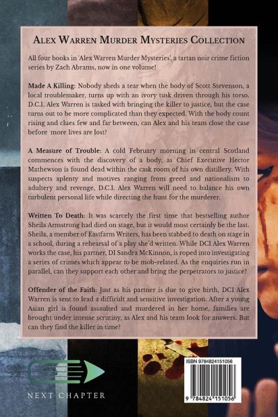 All four books in 'Alex Warren Murder Mysteries', a tartan noir crime fiction series by Zach Abrams, now in one volume! Made A Killing: Nobody sheds a tear when the body of Scott Stevenson, a local troublemaker, turns up with an ivory tusk driven through his torso. D.C.I. Alex Warren is tasked with bringing the killer to justice, but the case turns out to be more complicated than they expected. With the body count rising and clues few and far between, can Alex and his team close the case before more lives are lost? A Measure of Trouble: A cold February morning in central Scotland commences with the discovery of a body, as Chief Executive Hector Mathewson is found dead within the cask room of his own distillery. With suspects aplenty and motives ranging from greed and nationalism to adultery and revenge, D.C.I. Alex Warren will need to balance his own turbulent personal life while directing the hunt for the murderer. Written To Death: It was scarcely the first time that bestselling author Sheila Armstrong had died on stage, but it would most certainly be the last. Sheila, a member of Eastfarm Writers, has been stabbed to death on stage in a school, during a rehearsal of a play she'd written. While DCI Alex Warren works the case, his partner, DI Sandra McKinnon, is roped into investigating a series of crimes which appear to be mob-related. As the enquiries run in parallel, can they support each other and bring the perpetrators to justice? Offender of the Faith: Just as his partner is due to give birth, DCI Alex Warren is sent to lead a difficult and sensitive investigation. After a young Asian girl is found assaulted and murdered in her home, families are brought under intense scrutiny, as Alex and his team look for answers. But can they find the killer in time?