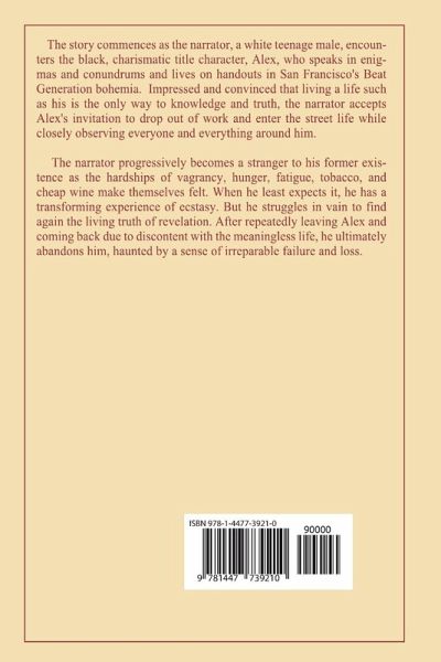 This story of an initiation begins with the white middle-class, teen-age narrator meeting charismatic, black, ageless Alex, who speaks in enigmas and conundrums and lives as a vagrant in San Francisco's Beat Generation bohemia. Convinced that Alex possesses the key to superior awareness, the boy seeks his guidance. "Come with me, kid. I'll take care of you," Alex replies. Accepting this fatherly invitation, intent on learning from Alex, the boy drops out. The hardships of hunger, tobacco, and cheap wine soon make themselves felt. Having become a stranger to his former self, he experiences ecstatic revelation: "So this is what Alex is all about! Ecstasy!" Perfect awareness cannot be retained. The boy seeks in vain to reconnect. Despairing, he repeatedly leaves Alex; but discontent with a life become meaningless irresistibly draws him back, until increasing signs of Alex's mental alienation overwhelm him, and he finally abandons Alex, haunted by a sense of loss.